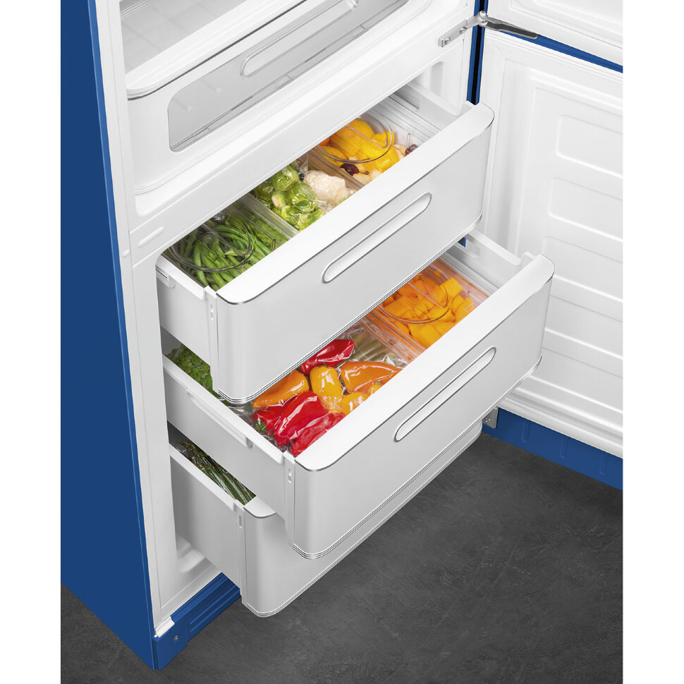 Холодильник SMEG FAB32RBE5 предназначен для кратковременного хранения различных готовых блюд, охлаждённых продуктов и напитков, а также для заморозки и длительного хранения замороженных продуктов и полуфабрикатов. Полки изготовлены из закалённого стекла, благодаря чему выдерживают большую нагрузку. Полки на дверцах выполнены из пластика. Данная модель идеально подойдёт для авторских интерьеров в уникальном стиле или для кухонь в классическом исполнении.