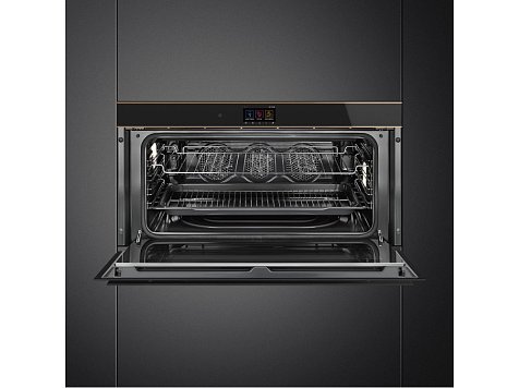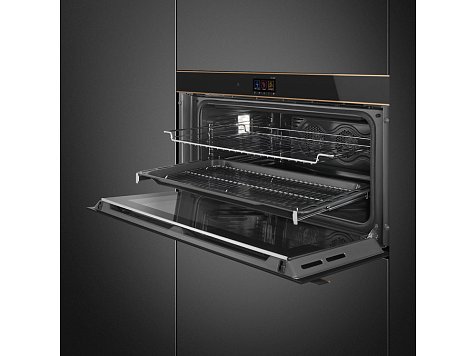 Духовой шкаф Smeg SFPR9604TNR из коллекции Dolce Stil Novo выполнен в черном цвете. Дизайн прибора дополняют медные профили. Модель шириной 90 см обладает объемом в 85 литров, что позволяет комфортно готовить несколько блюд сразу или, например, запекать индюшку целиком. Удобное управление при помощи сенсорного дисплея обеспечивает быструю настройку параметров работы устройства: выбор режима приготовления, температуры, времени, а также таких функций, как отложенный старт или размораживание.