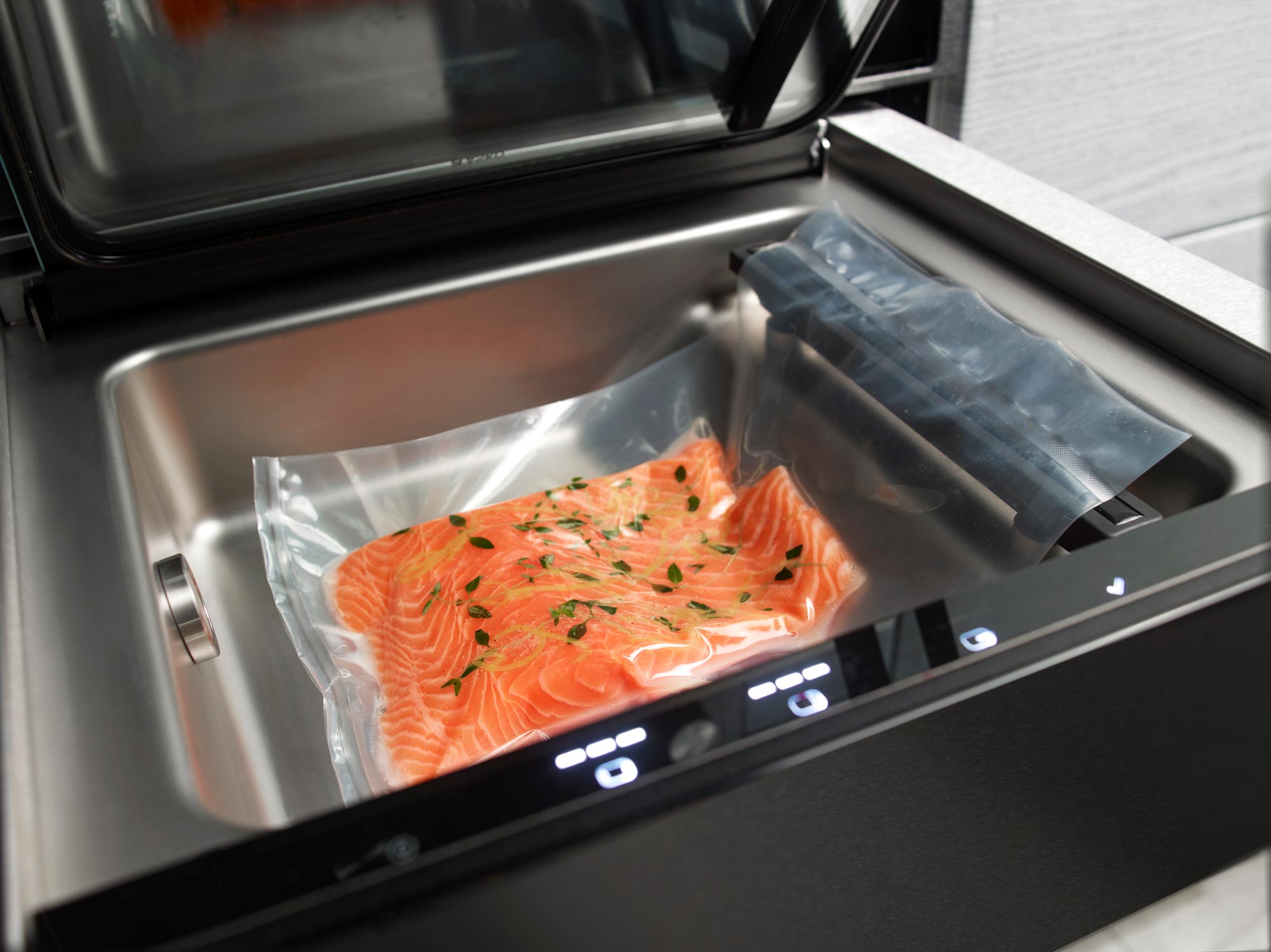 Вакууматор Asko ODV8127B станет незаменимым помощником на Вашей кухне. Устройство работает со стандартными пакетами 25×35 см, что делает эксплуатацию удобнее. Товар выполнен в цвете черная сталь, что подойдет к любой кухне и дополнит его интерьер. Управление осуществляется за счет сенсорной панели, которая находится за фронтальной частью. Благодаря этому она защищена от пыли и других воздействий. Интуитивно понятные кнопки делают навигацию простой и удобной. Выдвигается устройство на телескопических направляющих с фиксацией. Это помогает легко открывать и закрывать девайс. Открывается данная техника по принципу touch2Open. То есть необходимо нажать на фронтальную часть, тогда механизм сработает. Отсутствие ручек гарантируют безопасность данного процесса.